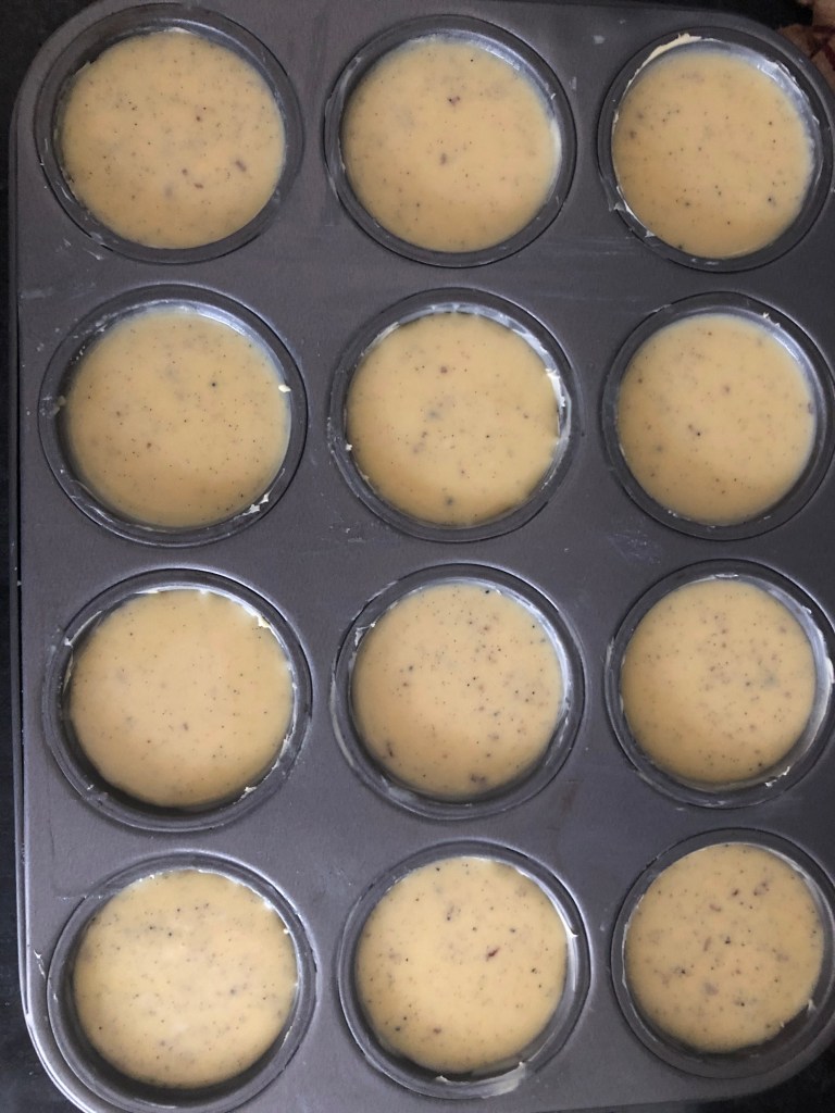 Heat the oven to 220c. grease you special canelé tin with melted beeswax (muffin tin with butter) and fill them to not quite the top.